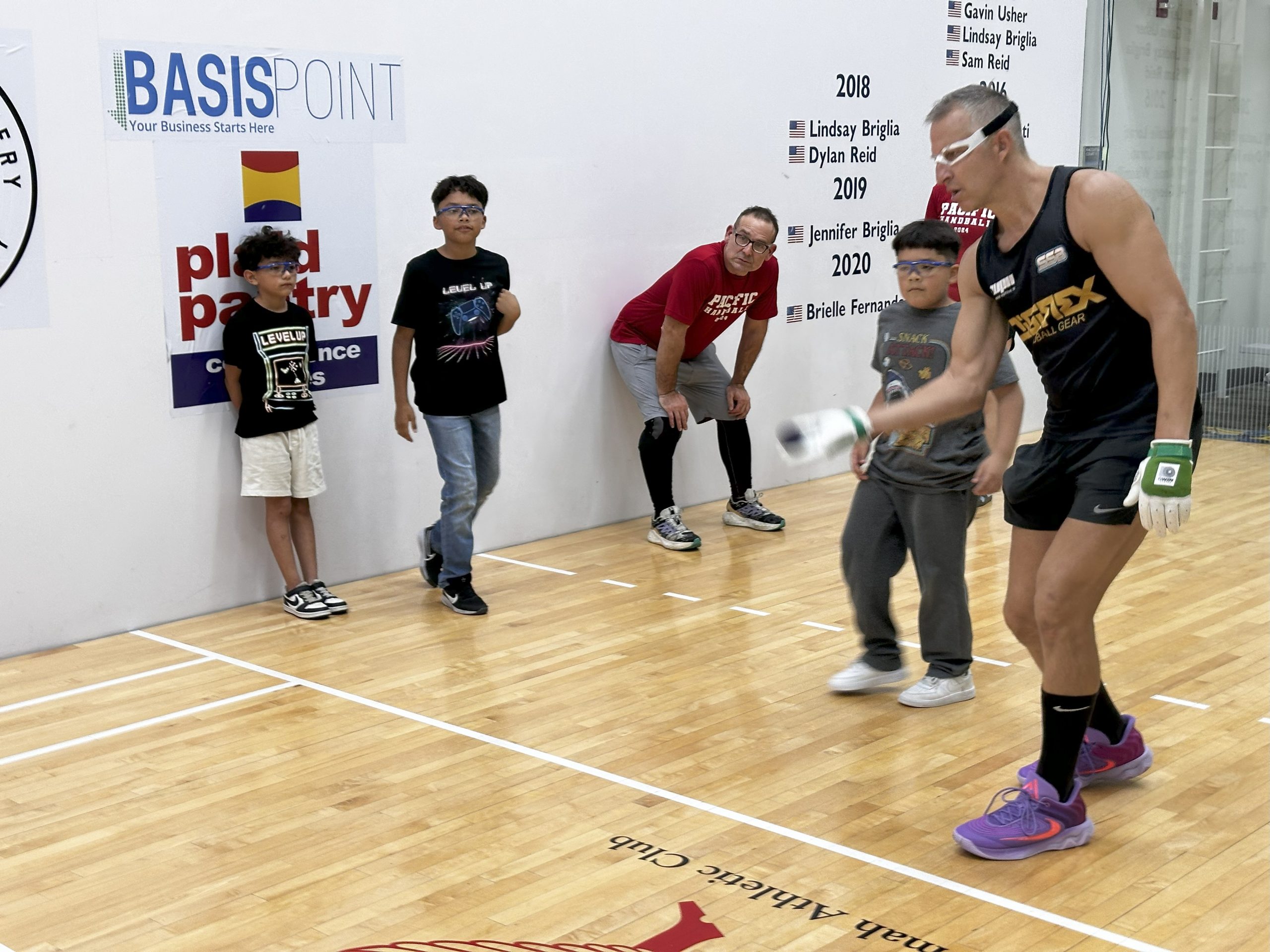 Coach Fink taught the fundamentals of the sidearm stroke, followed by sidearm kill and sidearm serve technique. Fink then demonstrated the overhand to the ceiling and fist to the ceiling shots, followed by the back wall technique.