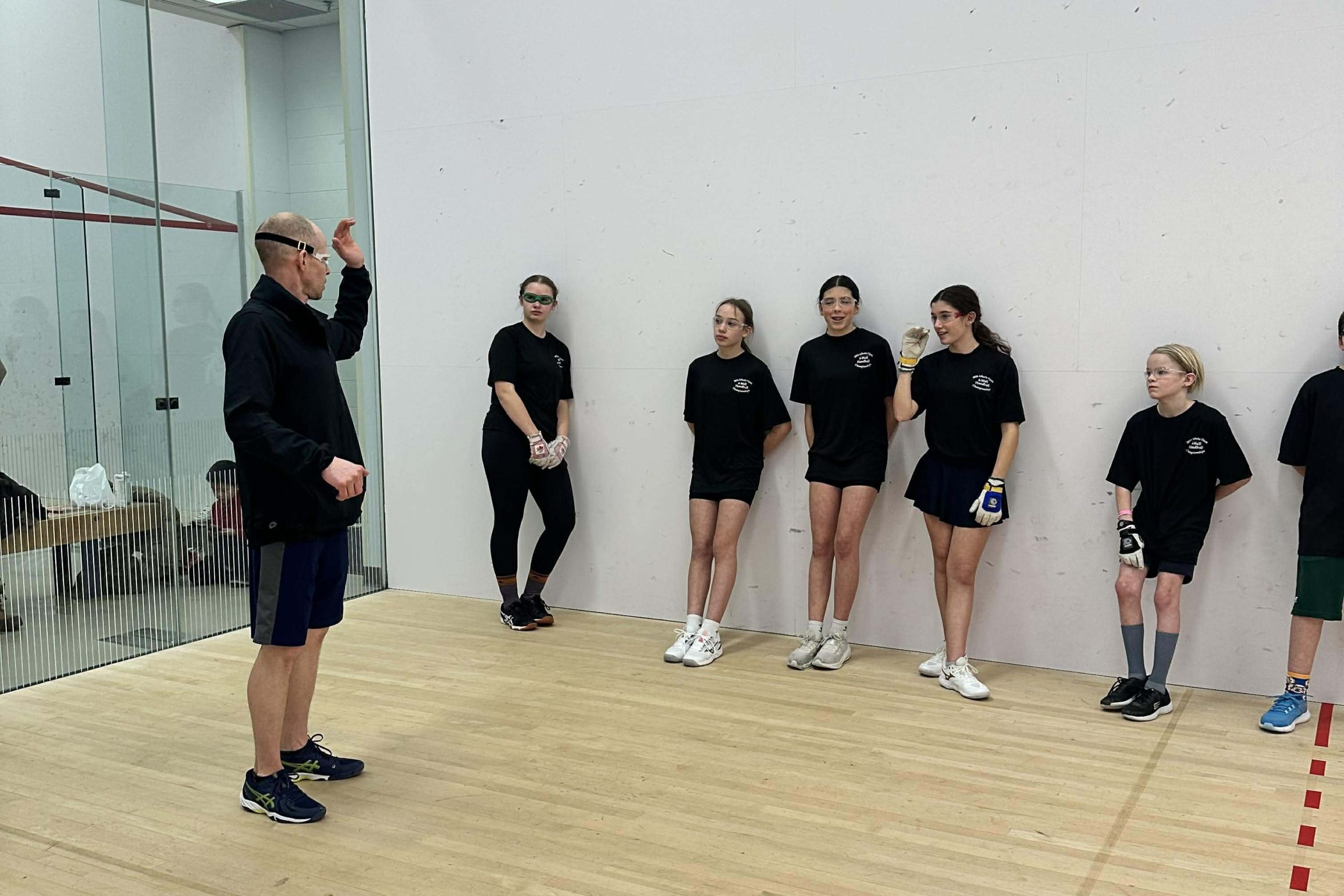 Canadian handball star Shane Vigen enthusiastically coached a JR WPH clinic at the 2026 Alberta Open 4-Wall Handball Championships.