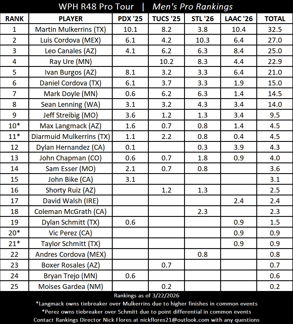 Martin Mulkerrins won his sixteenth Race 4 Eight Men’s Pro title at the 2026 LAAC, overcoming 0-12 and 1-10 deficits in the first two games of the final to retain his number one ranking. Lucho Cordova remained number two after finishing t3 at the LAAC, while Leo Canales’s fourth Race final inched him closer to Lucho at number two. Ure and Burgos remained at numbers four and five, respectively, while Danos Cordova jumped to number six, Mark Doyle slid down one spot to number seven, and Sean Lenning moved to number eight. National Handball Center Captain Jeff Streibig earned his career-best Race ranking at number nine, while the LAAC’s Dylan Hernandez jumped from number twenty-nine to number twelve after his career-best sixth place finish at the 2026 LAAC.