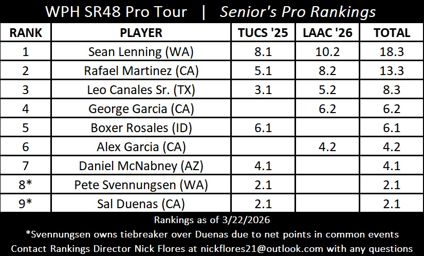 Sean Lenning remained the SR number one after winning his first SR title of the season at the 2026 LAAC, while Rafa Martinez jumped to number two in the SR rankings after making his first SR final on his homecourt at the LAAC. Leo Canales, Sr. and George Garcia rounded out the SR Fab 4.